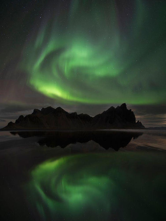 Northern Lights above Vestrahorn beach near Hofn in the southeast of Iceland White Modern Wood Framed Art Print with Double Matting by Steve Mohlenkamp