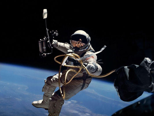 Astronaut Edward White during first EVA performed during Gemini 4 flight White Modern Wood Framed Art Print with Double Matting by NASA