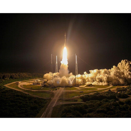 Off to space Black Modern Wood Framed Art Print by NASA