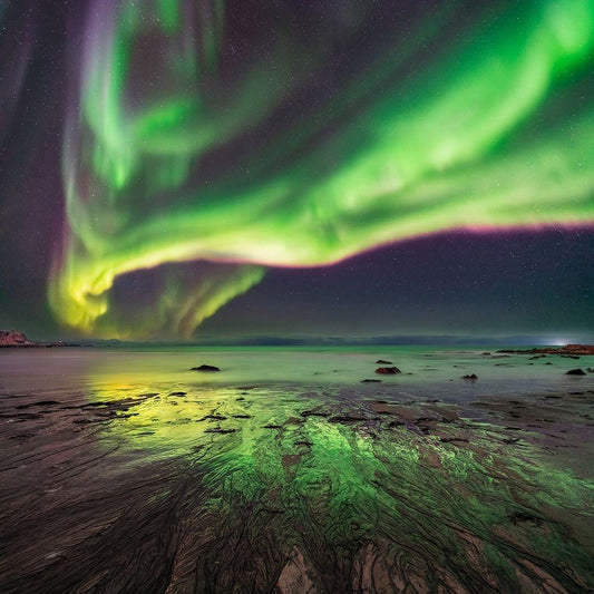The Northern Lights Are Reflecting In The Ocean Black Modern Wood Framed Art Print by Simon, Petr