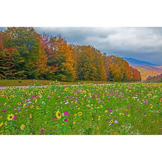 USA-New Hampshire-White Mountains in background with meridian planted with flowers along Interstate Black Modern Wood Framed Art Print by Gulin, Sylvia