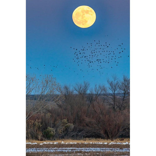 USA-New Mexico-Bosque Del Apache National Wildlife Refuge-Full moon rising and flying blackbirds Black Modern Wood Framed Art Print by Jaynes Gallery