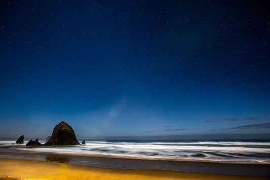 USA- Oregon. Cannon Beach and Haystack Rock stars showing during blue light. Black Modern Wood Framed Art Print by Gulin, Darrell