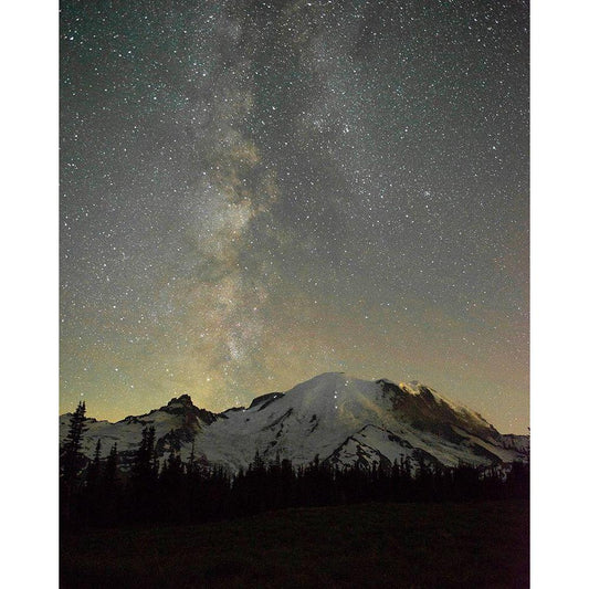 The lights of climbers can be seen on the mountain as the Milky Way rises behind Mt Rainier Black Modern Wood Framed Art Print by Probst, Greg
