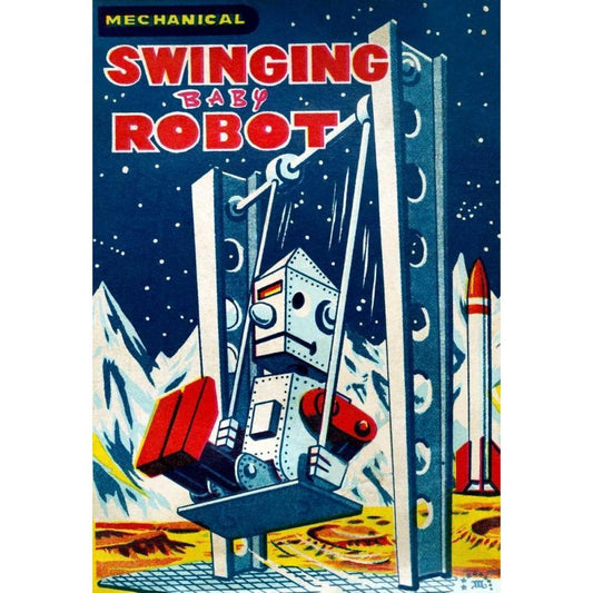 Swinging Baby Robot Black Modern Wood Framed Art Print by Retrobot