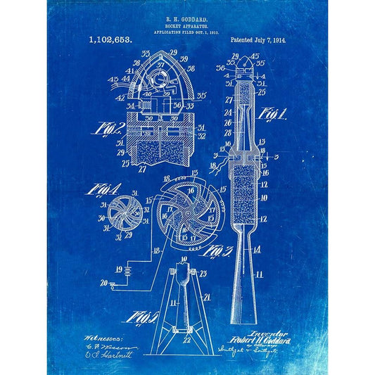 PP230-Faded Blueprint Robert Goddard Rocket Patent Poster Black Modern Wood Framed Art Print by Borders, Cole