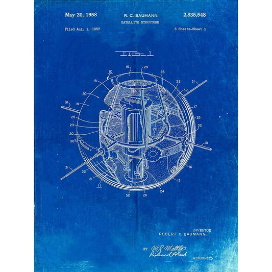 PP52-Faded Blueprint Earth Satellite Patent Poster Black Modern Wood Framed Art Print by Borders, Cole