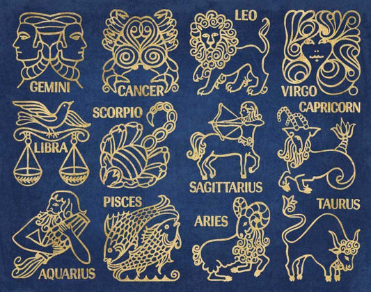 Whats Your Sign Blue Gold White Modern Wood Framed Art Print with Double Matting by Wild Apple Portfolio