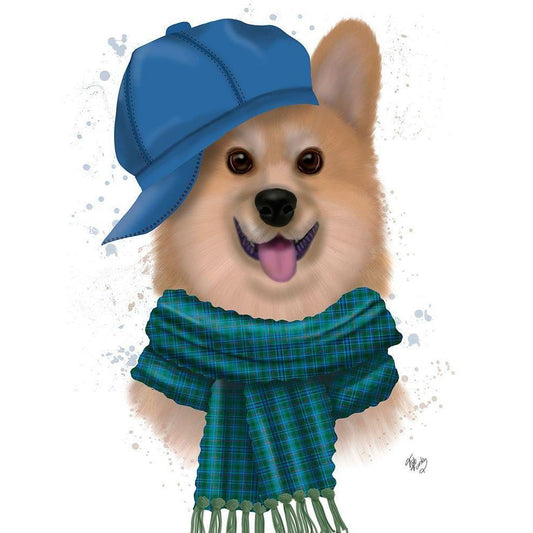 Corgi Baseball Hat and Scarf Gold Ornate Wood Framed Art Print with Double Matting by Fab Funky