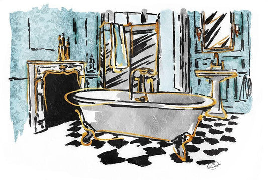 Blue Gold Sketch Bath White Modern Wood Framed Art Print with Double Matting by OnRei