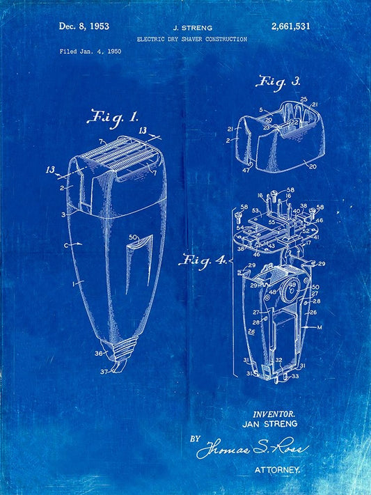 PP1011-Faded Blueprint Remington Electric Shaver Patent Poster White Modern Wood Framed Art Print with Double Matting by Borders, Cole