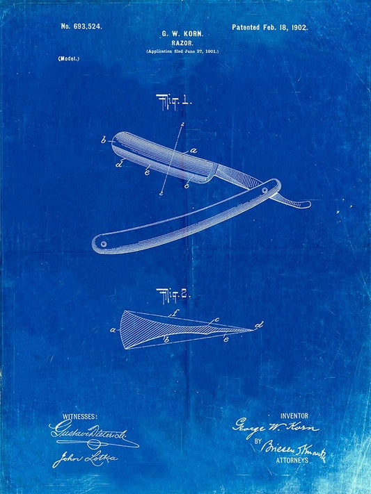 PP1178-Faded Blueprint Straight Razor Patent Poster White Modern Wood Framed Art Print with Double Matting by Borders, Cole