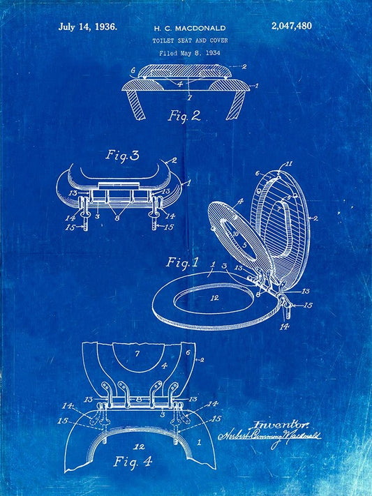 PP130- Faded Blueprint Toilet Seat Poster White Modern Wood Framed Art Print with Double Matting by Borders, Cole
