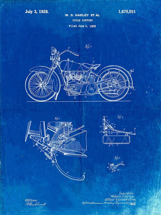 PP10-Faded Blueprint Harley Davidson Model JD Patent Poster White Modern Wood Framed Art Print with Double Matting by Borders, Cole