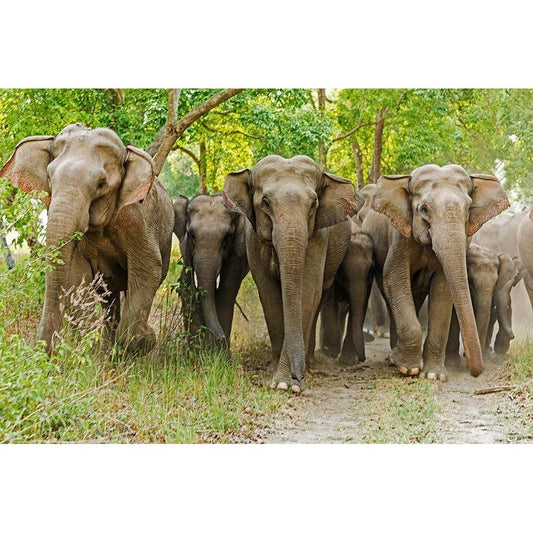 Asian Elephant family on the jungle track Corbett National Park-India White Modern Wood Framed Art Print by Rajput, Jagdeep