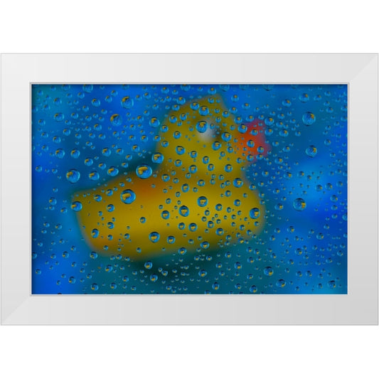 USA- Washington State- Sammamish. Yellow rubber duck in reflections in dew drops White Modern Wood Framed Art Print by Gulin, Darrell