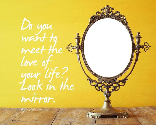 Byron Katie Quote: Look in the Mirror White Modern Wood Framed Art Print with Double Matting by ArtsyQuotes