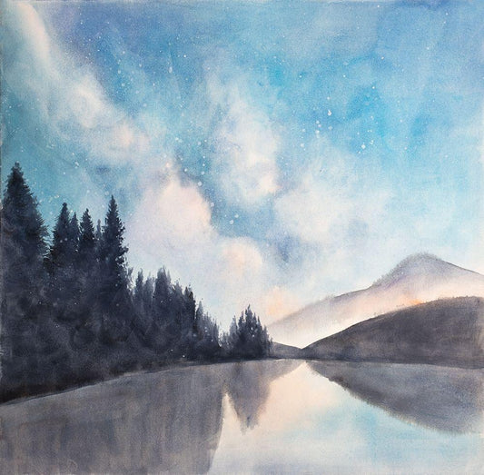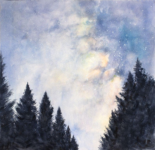 STARRY SKY IN A DARK FOREST White Modern Wood Framed Art Print with Double Matting by Atelier B Art Studio