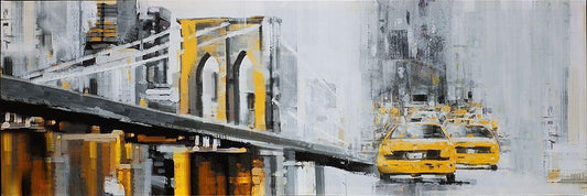 YELLOW BROOKLYN BRIDGE WITH TAXIS White Modern Wood Framed Art Print with Double Matting by Atelier B Art Studio