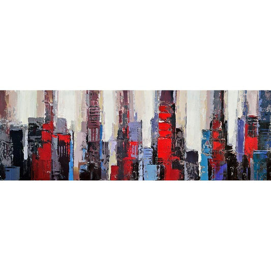 ABSTRACT RED AND BLUE BUILDINGS Black Modern Wood Framed Art Print by Atelier B Art Studio