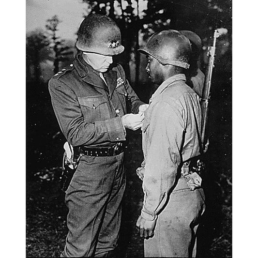 WWII Lt. Gen. George S. Patton-U.S. Third Army commander-pins the Silver Star on Private Ernest A. J Gold Ornate Wood Framed Art Print with Double Matting by U.S. Archives