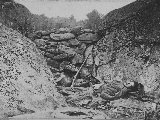 Rocks could not save him at the Battle of Gettysburg White Modern Wood Framed Art Print with Double Matting by OSullivan, Timothy H