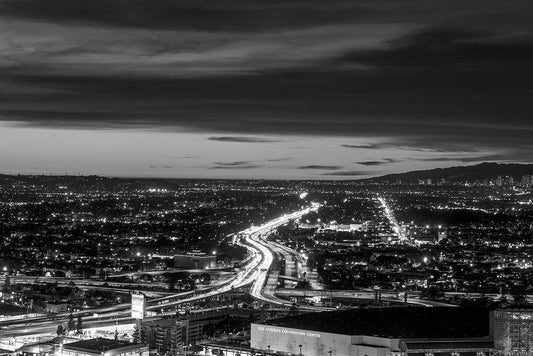 Dusk skyline view of Los Angeles California looking west over the Santa Monica freeway White Modern Wood Framed Art Print with Double Matting by Highsmith, Carol
