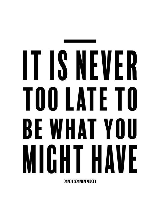 George Eliot Quote: Never Too Late White Modern Wood Framed Art Print with Double Matting by ArtsyQuotes