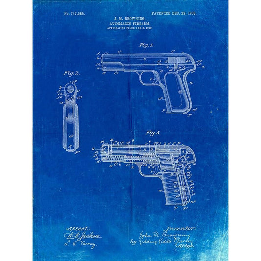 PP894-Faded Blueprint J.M. Browning Pistol Patent Poster Gold Ornate Wood Framed Art Print with Double Matting by Borders, Cole