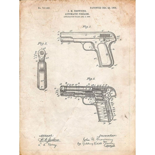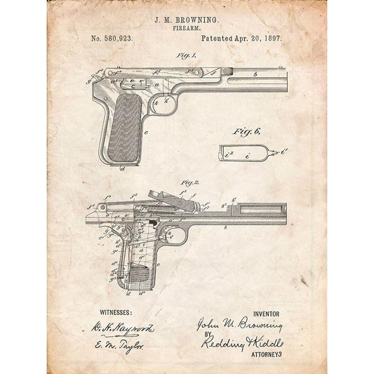 PP894-Vintage Parchment J.M. Browning Pistol Patent Poster Gold Ornate Wood Framed Art Print with Double Matting by Borders, Cole