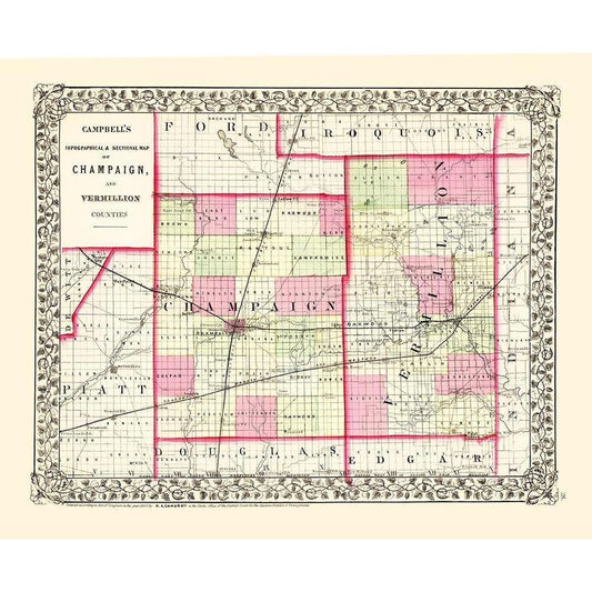 Champaign Vermillion Illinois - Campbell 1850 Gold Ornate Wood Framed Art Print with Double Matting by Campbell