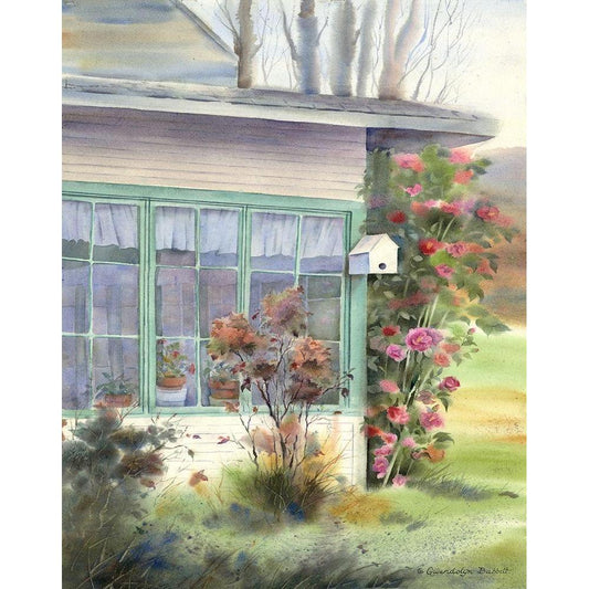 White Barn and Roses Gold Ornate Wood Framed Art Print with Double Matting by Babbitt, Gwendolyn