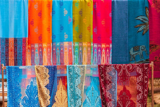 Laos- Luang Prabang. Colorful textiles- possibly scarves- for sale. Black Ornate Wood Framed Art Print with Double Matting by Haseltine, Tom