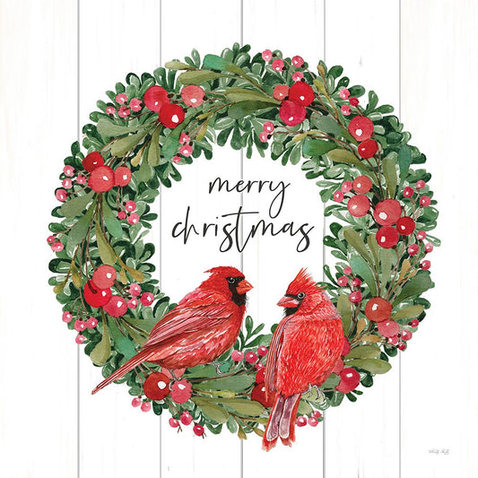 Merry Christmas Cardinal Wreath Black Ornate Wood Framed Art Print with Double Matting by Jacobs, Cindy