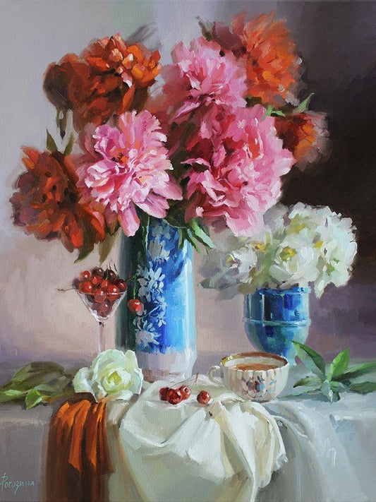 Scarlet Peonies White Modern Wood Framed Art Print with Double Matting by Rogozina, Svetlana