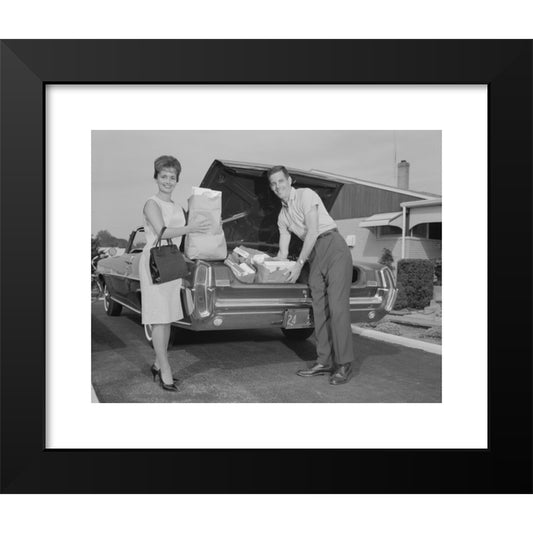 1960's Image Collection by ClassicStock - Black Modern Wood Framed Art Print Titled: 1960s COUPLE UNPACKING GROCERY BAGS FROM AUTOMOBILE TRUNK
