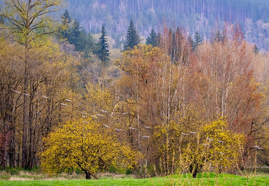USA-Washington State-Carnation early spring and trees just budding out and Canada Geese Black Ornate Wood Framed Art Print with Double Matting by Gulin, Sylvia