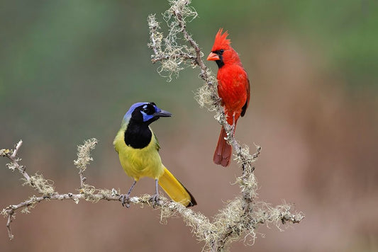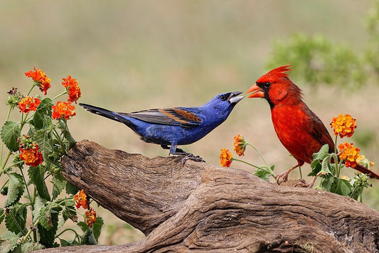 Blue grosbeak and male Northern cardinal fighting Rio Grande Valley-Texas Black Ornate Wood Framed Art Print with Double Matting by Jones, Adam