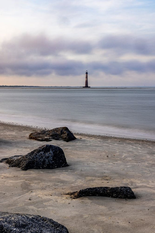 USA- South Carolina- Charleston. Folly Beach and Morris Island Lighthouse Black Ornate Wood Framed Art Print with Double Matting by Looney, Hollice