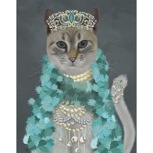 Grey Cat With Bells, Portrait White Modern Wood Framed Art Print by Fab Funky