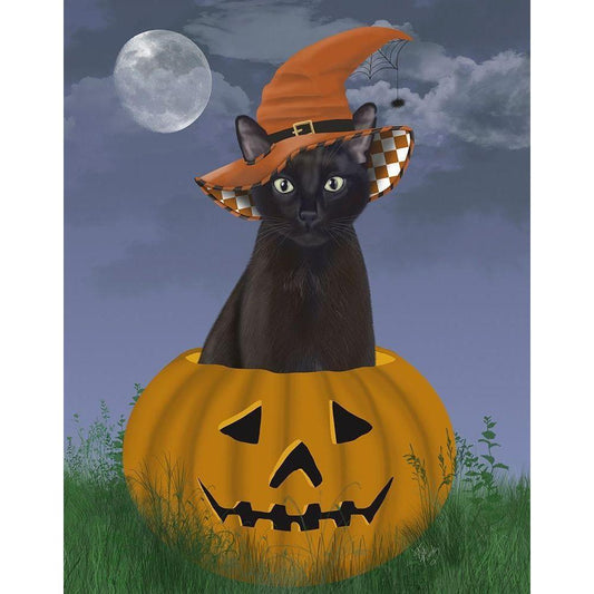 Halloween Black Cat in Pumpkin White Modern Wood Framed Art Print by Fab Funky