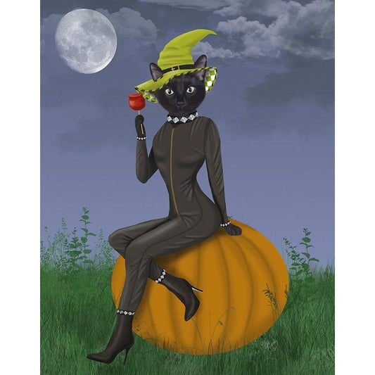 Halloween Cat and Toffee Apple White Modern Wood Framed Art Print by Fab Funky