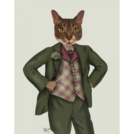 Cat in Tartan Waistcoat White Modern Wood Framed Art Print by Fab Funky