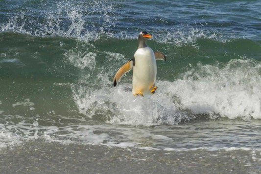 Sea Lion Island Gentoo penguin surfing on shore White Modern Wood Framed Art Print with Double Matting by Illg, Cathy and Gordon
