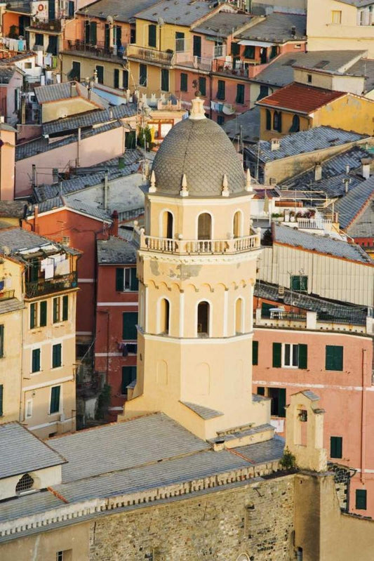 Italy, Vernazza Cathedral and city buildings White Modern Wood Framed Art Print with Double Matting by Flaherty, Dennis