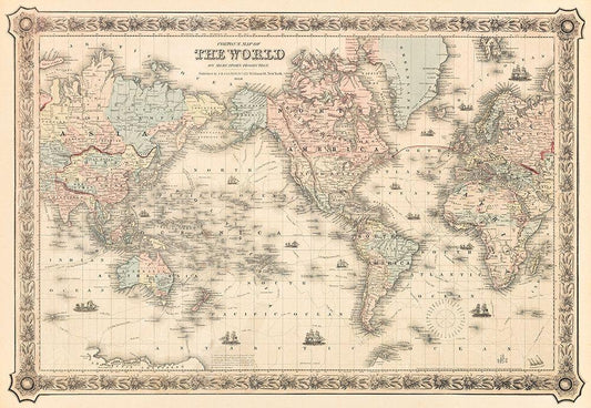 Coltons Map of the World on Mercators Projection 1858 White Modern Wood Framed Art Print with Double Matting by J H Colton and Co