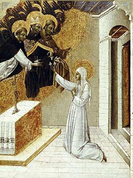 St. Catherine Invested With The Dominican Scapula White Modern Wood Framed Art Print with Double Matting by Di Paolo, Giovanni
