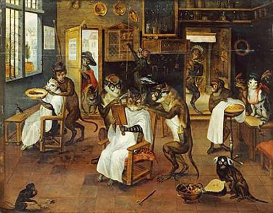 A Singerie: Monkey Barbers Serving Cats White Modern Wood Framed Art Print with Double Matting by Van Kessel, Jan