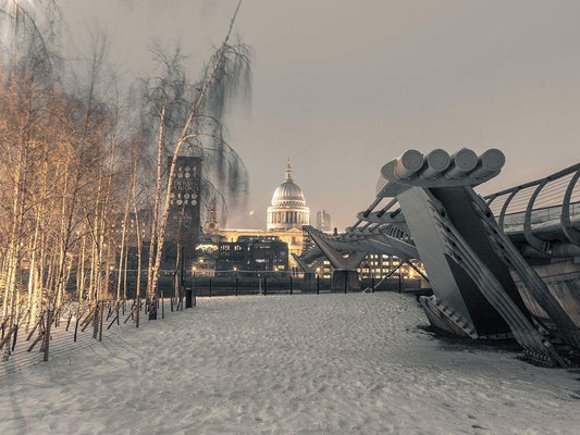 St Pauls Cathedral and Millennium Bridge in snow-London-UK White Modern Wood Framed Art Print with Double Matting by Frank, Assaf