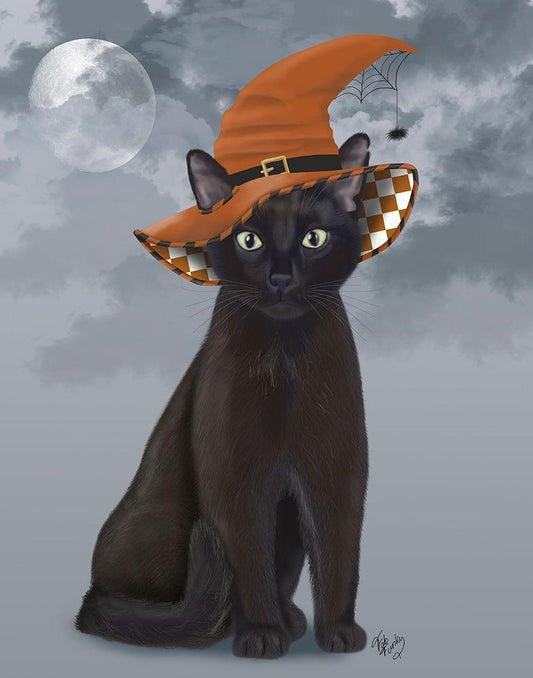 Halloween Black Cat in Witches Hat White Modern Wood Framed Art Print with Double Matting by Fab Funky